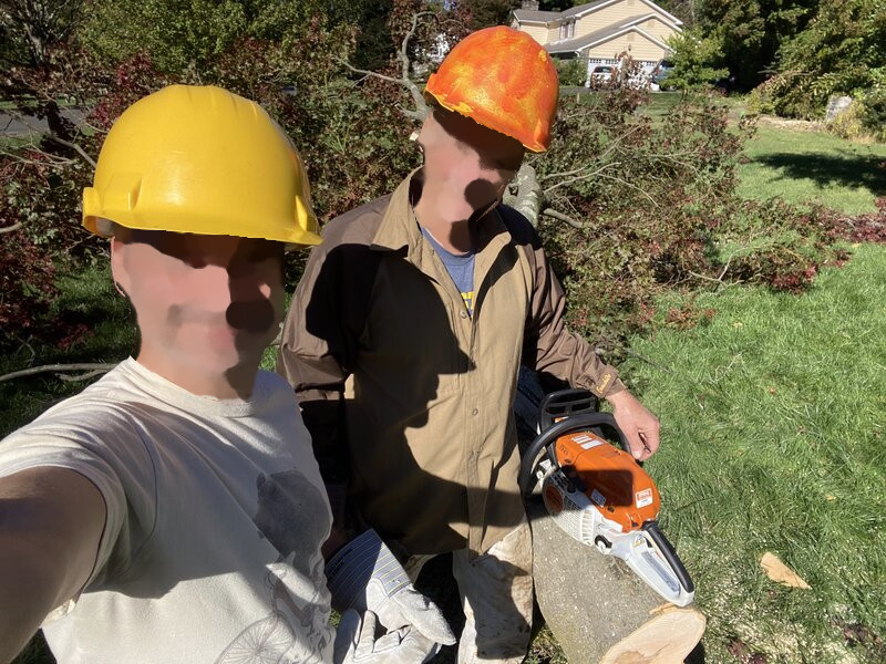 Then the day came and my father-in-law arrived at around 10 in the morning with his gear. I climbed up and tied the neighbor's heavy rope about halfway up and then FIL walked the other end into the yard and got into a tug-of-war stance. I pulled on the helmet he lent me and got to work. It's been literal decades since I cut down a tree, and it was as much fun, or perhaps more, than when I was running around the woods behind my house in my early teens chopping down dead trees with a hatchet to build forts. This time it was with a chainsaw. I had some trepidation when it wasn't beginning to fall when I thought it should, but another inch or so and it went exactly where I wanted it to. It was a great feeling of accomplishment.
